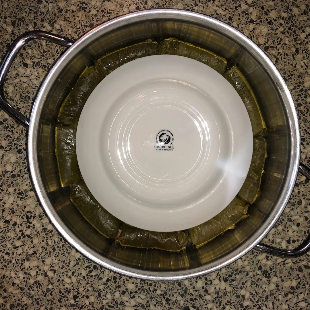 Tapamos los tolma con un plato, no para cubrirlos por completo, sino para dar estabilidad y que no se vayan cayendo o deshaciendo.